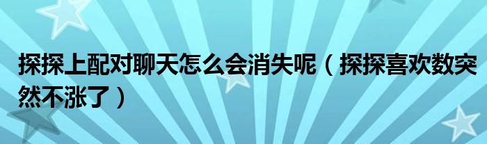 大家好,跳跳为你解答以上问题。探探上配对聊天怎么会消失呢,探探喜欢数突然不涨了这个问题很多人还不知道,现在让我们一起来看看吧!