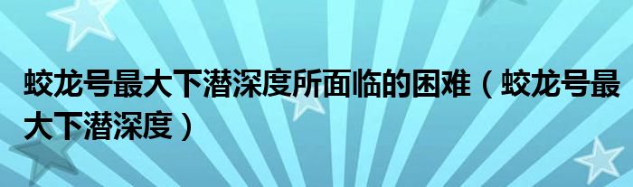 最佳答案关于蛟龙号最大下潜深度所面临的困难,蛟龙号最大下潜深度这个很多人还不知道,今天菲菲来为大家解答以上的问题,现在让我们一起来看看吧!1、蛟龙号第三次下潜科学考察和试验任务,最大下潜深度达5188米。2、2012年预计会进行七千米级海试,这次一共有三位潜航员,其选拔经过也很严苛,甚至要求不...