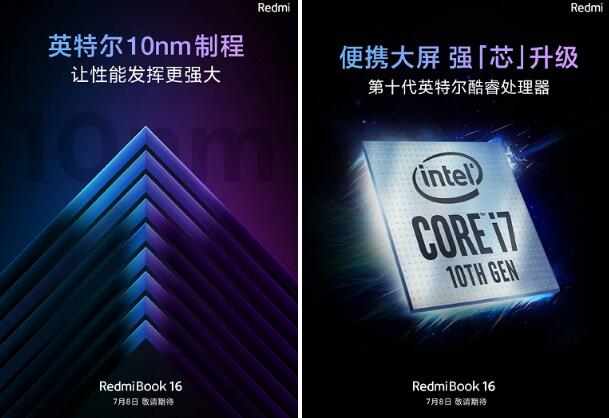 搭载第10代Intel Core i7处理器的RedmiBook 16将于7月8日发布。