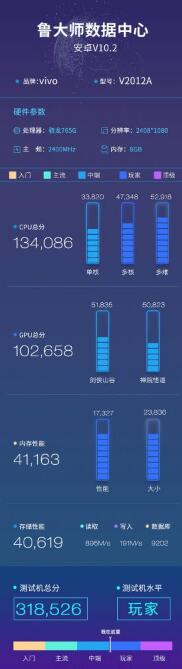 型号为V2012A的iQOO Z1x 5G在Master Lu v10.2上进行了基准测试。清单显示,它在CPU测试中得分134,086,在GPU测试中得分102,658,在内存测试中得分41,163,在存储测试中得分40,619。平均基准分数将其归类为中档类别,属于高端设备。